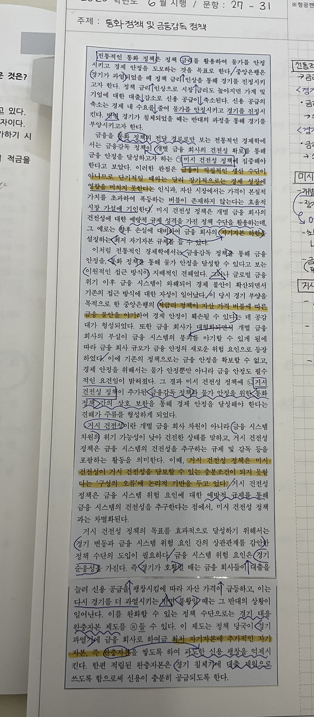 그리고, <보기>는 노란 형광펜 부분에 '대출을 늘려'라고 되어있는데, 그 문장 및 다음 문장의 마지막 부분을 보면 '~문제를 일으킬 수 있다.'라고 나와있네요. <보기>가 문제라고 하니까 대출 늘리는 것을 반대하는 입장이라고 보면 됩니다!