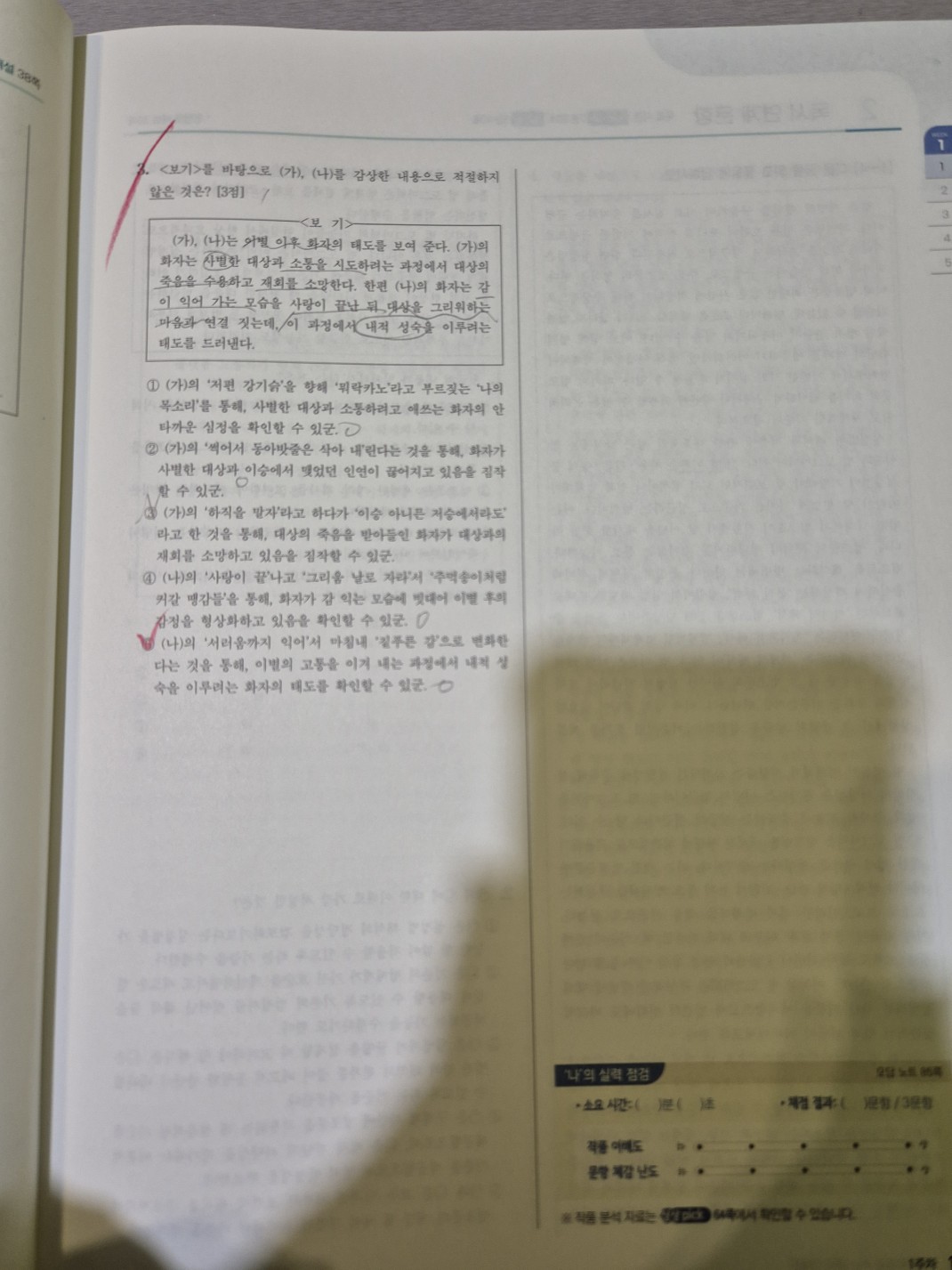 따라서 5. (나)의 '서러움까지 익어'서 마침내 '짙푸른 감'으로 변화한다 라는 부분이 틀렸습니다. 서러움이 익어서 짙푸른 감으로 변화하는게 아니라, 짙푸른 감의 상태에서 서러움이 익어 형형 등불을 밝히는 감이 되는 것이기 때문입니다.