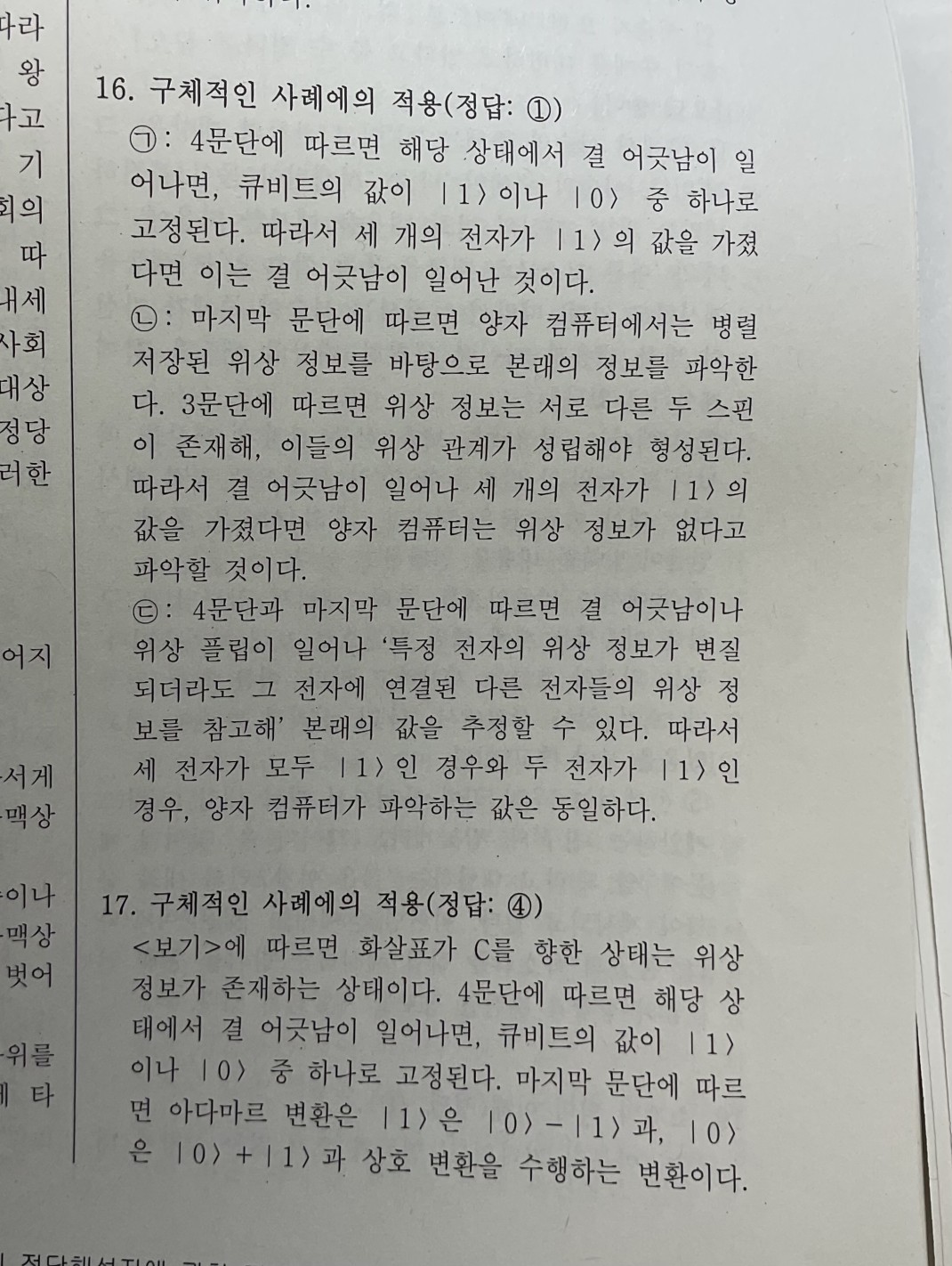 그렇게된다면 중첩상태에서 (0이나 1에 좀더 가까울 수 있는 - 2문단 마지막줄) 위상정보 (+,-)를 가지니까 B,C에 화살표가 표시된다면 세로축은 고정이 아니라 완전 A거나 완전 D만 아닌 세로축의 어딘가에 위치하므로 2번선지의 0과 가까운 정도가 같다는 틀릴 수 있는거 아닌가요?