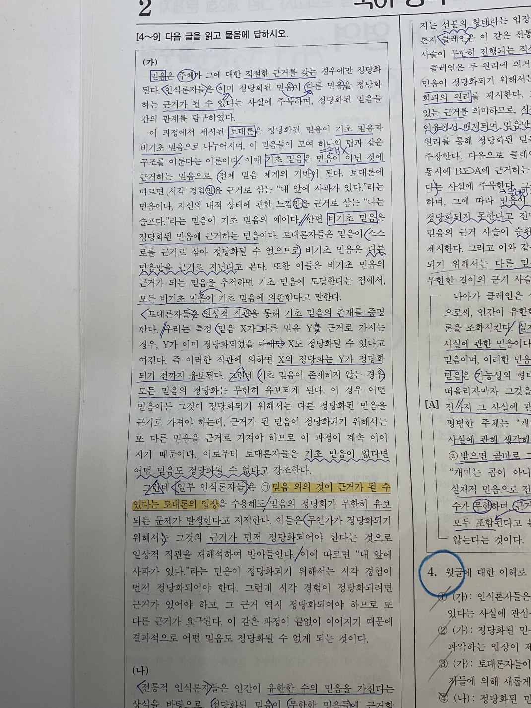 1. ㄱ에 친 노란색 밑줄부분에서 토대론은 믿음만이 믿음의 근거가 될 수 있다고 보는 입장 아닌가요? 왜 믿음 이외의 것이 근거가 될 수 있다고 하는지 잘 모르겠습니다2. 그리고 3번째 문단에서도 토대론자들이 믿음의 정당화는 무한히 유보된다고 하고 4번째 문단에서 일부 인식론자들도 무한히 유보된다고 하는데 두 입장 다 예시로 든 사례? 설명?이 같은말을 하고있는거 같은데 왜 일부인식론자들이 일상적 직관을 ‘재해석’ 했다는건지 잘 모르겠어요.ㅜㅜ