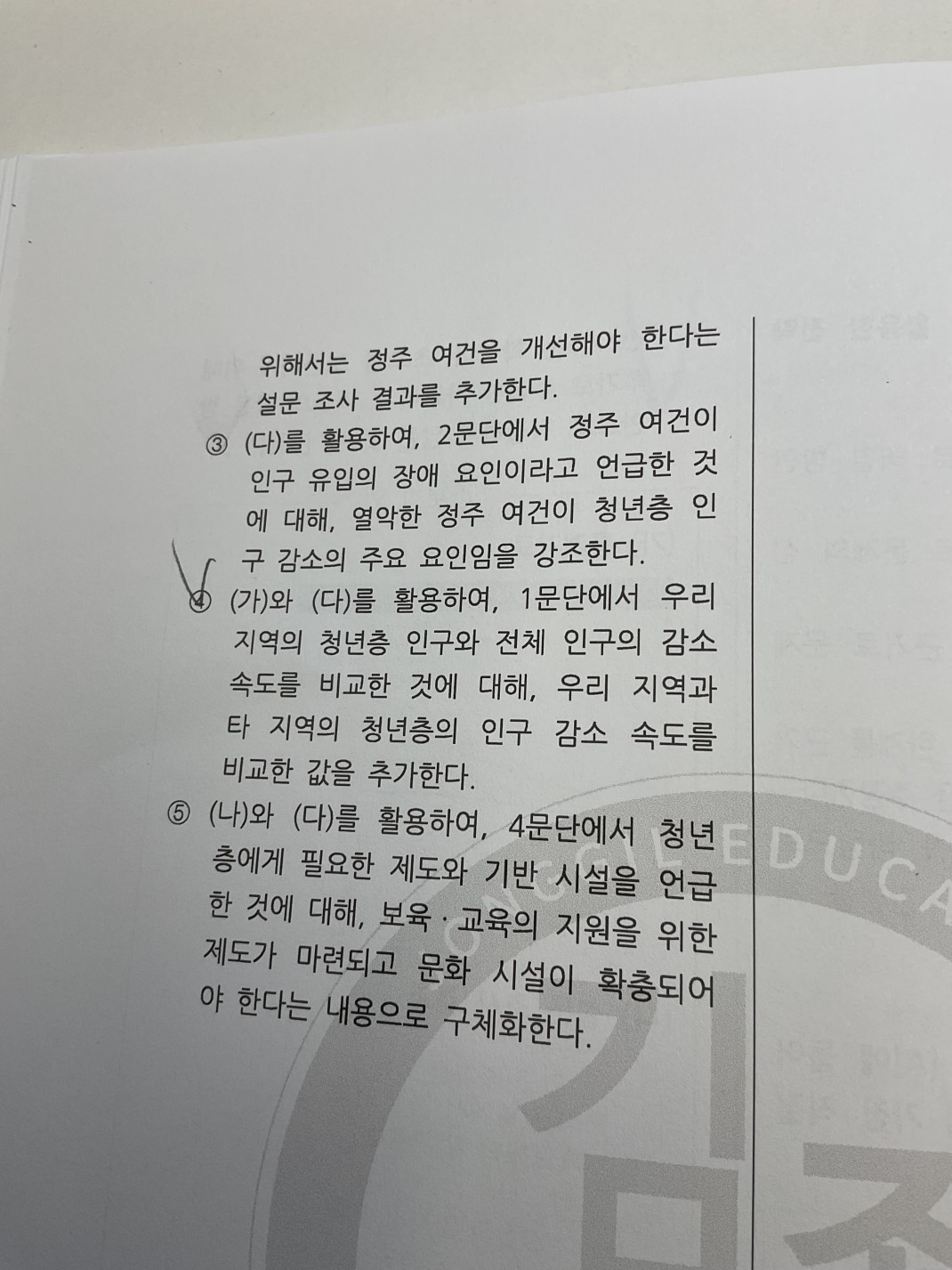 3번선지에서 정주여건은 주요요인임을 강조한다 에서 주요 요인이 아니라서 틀린선지라고 봐야하는거 아닌가요? 양질의 일자리 부족이 주요원인이다 라고 지문에도, (다)에도 나와있어서요주간노승욱08 Day3 화작 #17