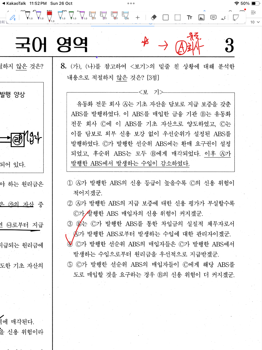 5번의 경우 환매요구권에 대한 내용입니다. 선순위 ABS 매입자의 경우 C에게 환매요구권을 행사할 수 있고, 그러면 C는 그것을 매입해야합니다. C의 경우 B의 페이퍼컴퍼니 형태이므로, 3번 선지에서 설명했듯 실질 관리자는 B입니다. 현재 A의 ABS에서 발생하는 수입이 감소하는 상황=신용 위험이 있는 상황에, 선순위 ABS도 C(B)가 갖게 된 상황이므로 신용 위험이 더 커진 상황입니다.