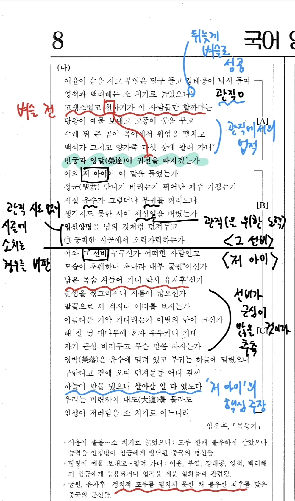 목동가는 위 그림에서 보다시피, 위 절반이 선비의 '시골에 소 치며 살지말고 나와서 벼슬하라'는 주장이며, 아래 절반은 '소 치며 은거해도 삶이 좋다'는 '저 아이'의 주장으로 이루어져 있습니다.