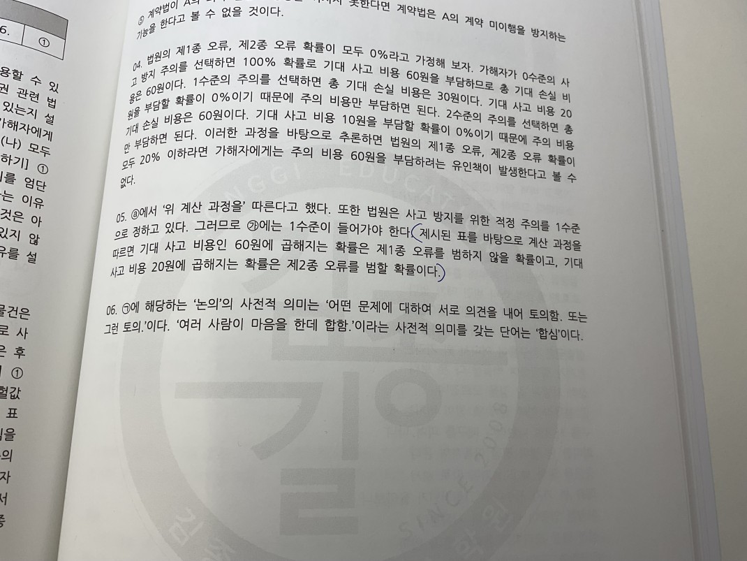 (나) : 0수준일때 주의비용 0원 = 가해자는 법 준수를 안했다는 의미=세운 가설이 성립=올바른 가설이므로 제 1종 오류 =법이 오류를 범하지않으면 60원 내야함=그러므로 법이 오류를 범하지않는 지금 딱 완벽한 올바른 가설상태가 기각되지않도록 빈칸에는 올자른 가설이 기각되는것을 범하지않을 확률이 들어가야함