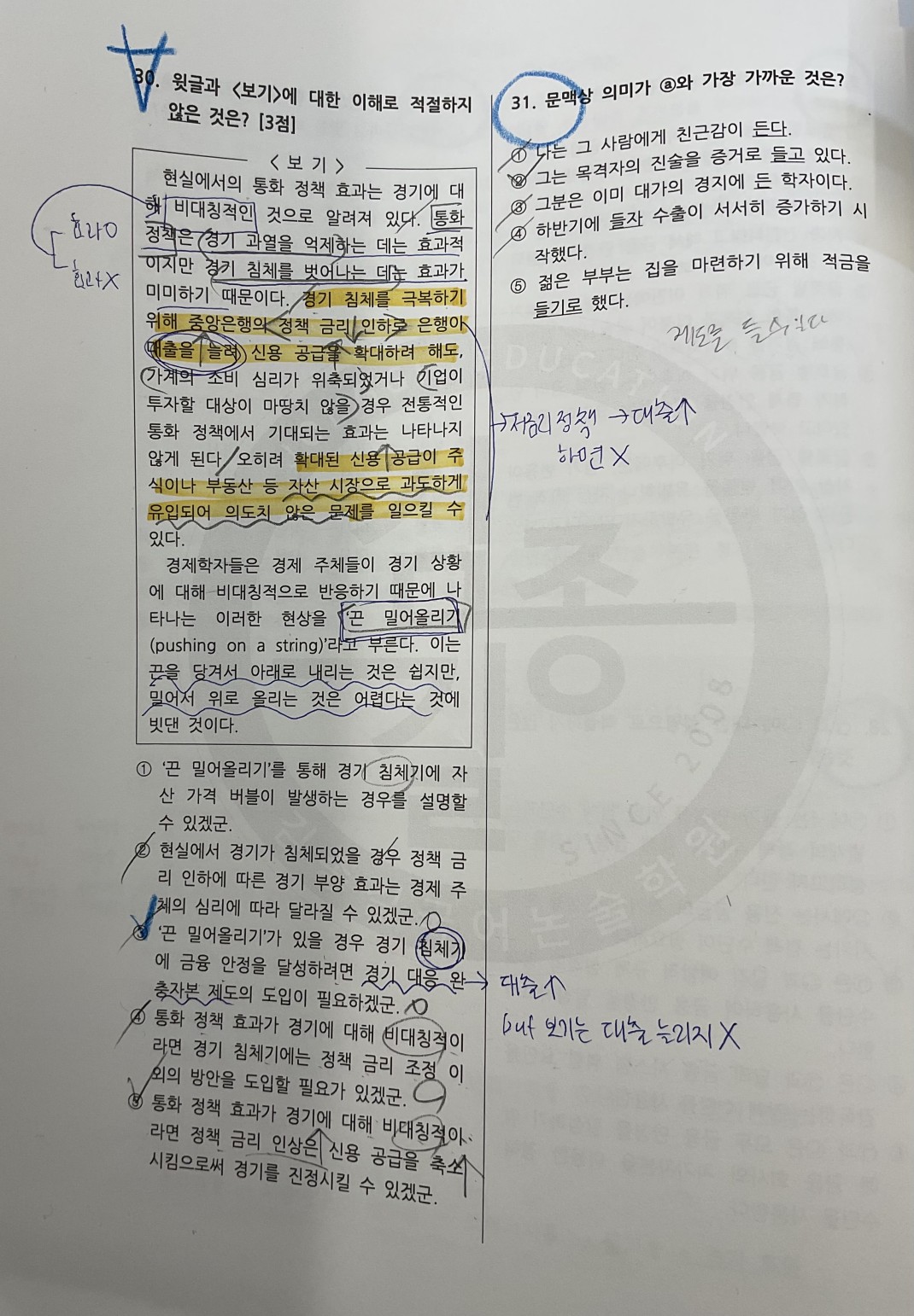 그리고, <보기>는 노란 형광펜 부분에 '대출을 늘려'라고 되어있는데, 그 문장 및 다음 문장의 마지막 부분을 보면 '~문제를 일으킬 수 있다.'라고 나와있네요. <보기>가 문제라고 하니까 대출 늘리는 것을 반대하는 입장이라고 보면 됩니다!