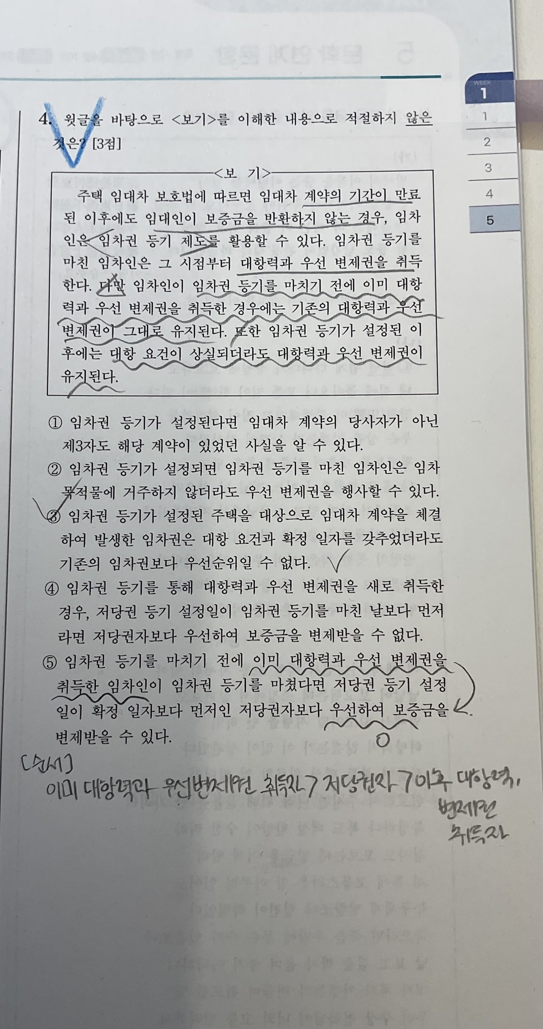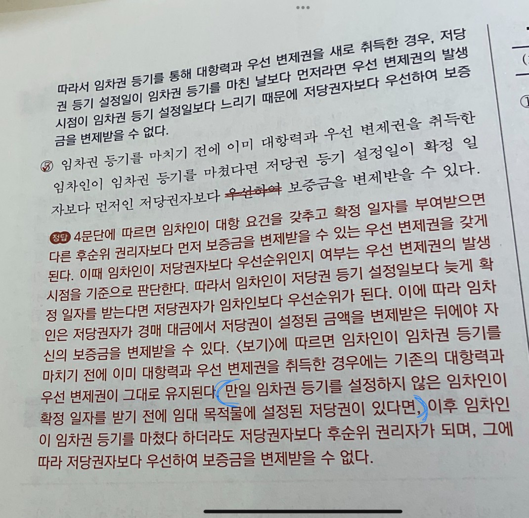 4번 문제 5번 선지에서 ”이미 대항력과 우선변재권을 취득한 임차인“ 이라고 가정?을 해놨으니까 저당권자 보다 우선하여 받는게 맞는 말인거 같은데 왜 틀렸다는건지 이해가 안가요!