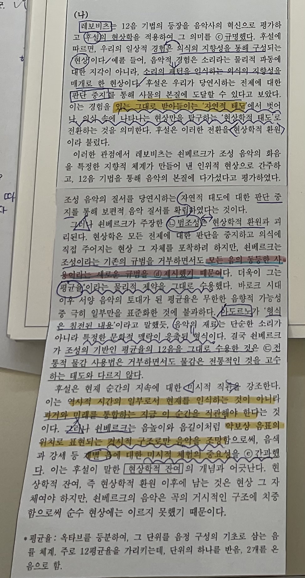 [답변 2.] (2)에 대한 답변 : 다음 문장간의 관계와 관련하여 설명할게요. 후설은 '미시적 직관'을 강조했습니다. 이는 ~ 지금 '이 순간'을 직관해야 한다는 것이라고 합니다. 그리고 나오는 문장이 '그러나 쇤베르크는 ~ 거시적 구조로만 음악을 조망' 했다고 비판받네요. 즉 노란 형광펜 친 문장은