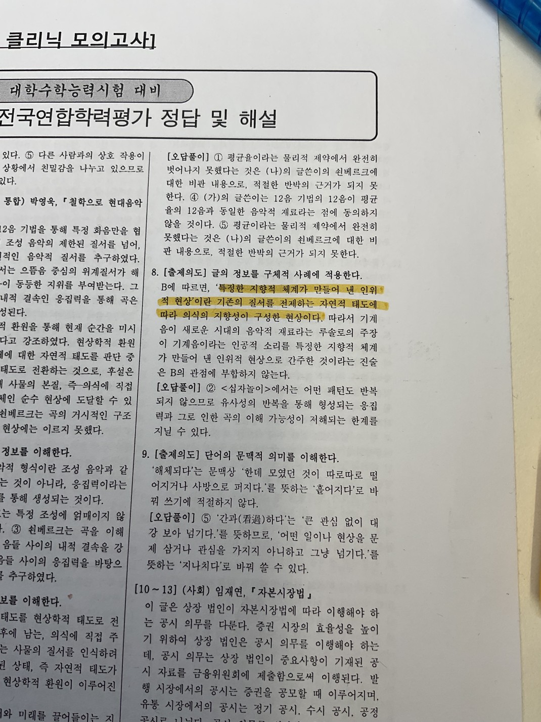 [답변 5.] '특정한 지향적 체계가 만들어낸 인위적 현상'은, (나)의 2문단 읽어보면, 쇤베르크가 [조성 음악(전통 음악)의 화음 = 특정한 지향적 체계가 만들어 낸 인위적 현상]. 즉, 이 글에서 전통 조성음악은 비판 대상이기에, '특정한 지향적 체계가 만들어낸 인위적 현상' 역시 부정적 단어(문장)입니다. '자연적 태도' 역시 벗어나야 할 부정적 태도인 것이므로, 맥락상 같은 부정성을 가지기는 합니다. 해설지는 이 둘을 연결지어 생각한 것이라고 봅니다. 1문단과 2문단이 이어지면서 '이러한 관점에서~' 라고 하고 있으므로, 둘을 연결 지은 것으로 봅니다.