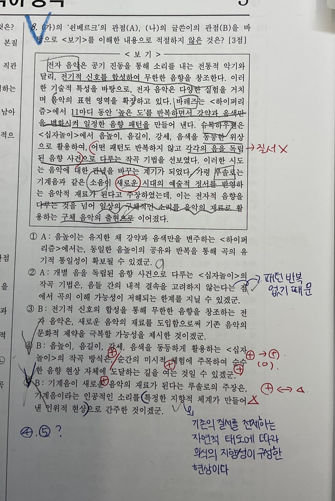 [답변 6.] 마지막 문단에 따르면 쇤베르크는 '음높이', '음길이' 처럼 악보상 음표의 위치로 표현되는 거시적 구조로만! 한 것이며, 8번의 4번은 강세, 음색 (특히 음색)같은 것(악보에 표현 X)도 동등하게 사용했다고 하므로, 쇤베르크와는 다른 것으로 본 것으로 보입니다. 사실 출제를 더 매끄럽게 했다면 그 뒤의 '어떤 패턴도 반복하지 않고'를 4번 선택지에 같이 표현해주어야 맞다고 봅니다.