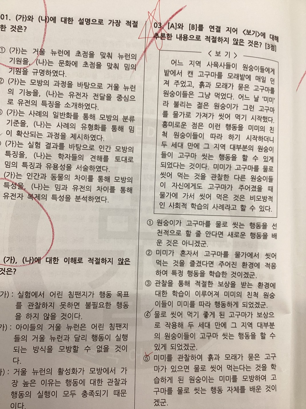 5번 선지에서 고구마를 씻어 먹는다는것을 학습한게 물로 씻는 행동자체를 터득한게 아닌가요?? 5번 해설이 이해가 잘 안가요