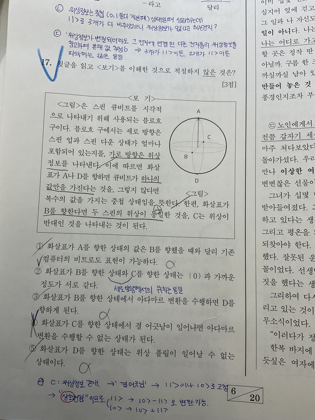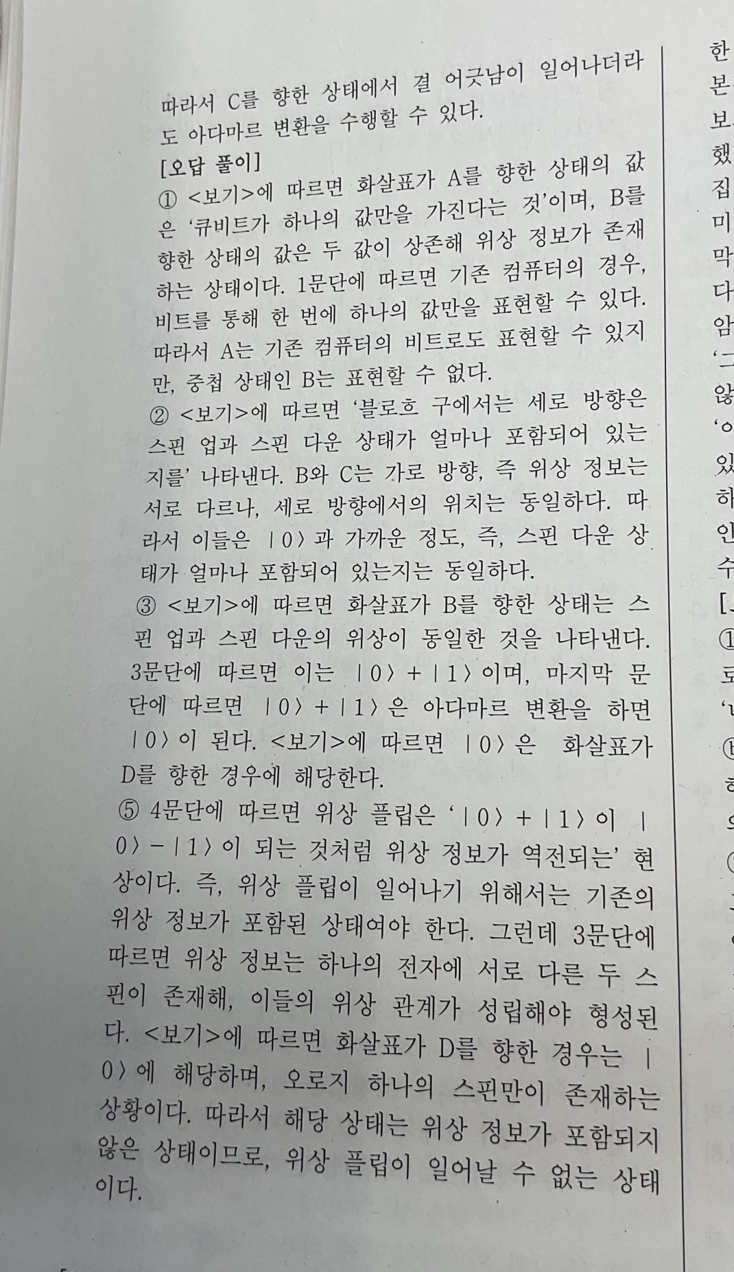 그렇게된다면 중첩상태에서 (0이나 1에 좀더 가까울 수 있는 - 2문단 마지막줄) 위상정보 (+,-)를 가지니까 B,C에 화살표가 표시된다면 세로축은 고정이 아니라 완전 A거나 완전 D만 아닌 세로축의 어딘가에 위치하므로 2번선지의 0과 가까운 정도가 같다는 틀릴 수 있는거 아닌가요?