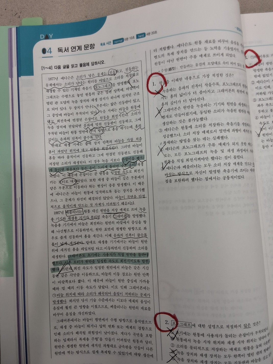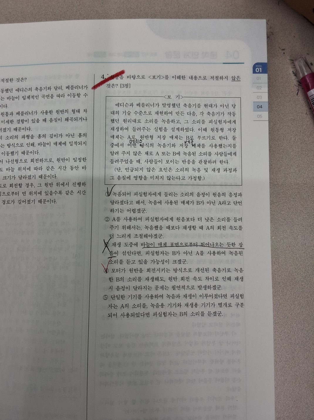 4번 문제에서 해설지에서는 1번이 답이 아닌 이유가 2문단에서 포노그래프는 손잡이를 돌리는 속도에 따라 음이 달라질 수 있다고 언급했고, 3문단에서 그래머폰도 초기에는 사용자가 직접 원판을 돌려야 했다고 언급되어 있어서 포노그래프와 그래머폰 둘 다 손잡이를 돌리는 속도에 따라 음정이 바뀔 수 있으므로 A라고 단언할 수 없다고 했는데, 그래머폰은 손잡이의 속도에 따라 음정이 바뀐다는 말이 없고 그냥 직접 돌리다가 모터로 발전했다고만 나와있잖아요..그냥 포노그래프와 똑같을거라고 가정하고 읽어야하는건가요? 포노그래프는 수직으로 홈을 새기고, 그래머폰은 좌우로 홈을 새기니까 그래머폰은 손잡이의 속도에 따라 음이 안바뀔수도 있잖아요.