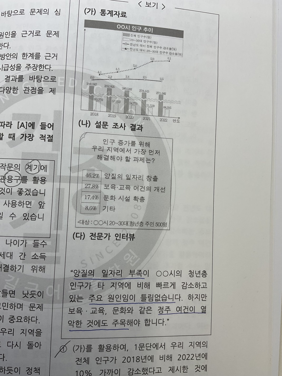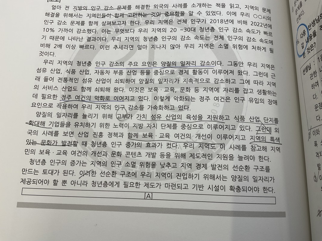 3번선지에서 정주여건은 주요요인임을 강조한다 에서 주요 요인이 아니라서 틀린선지라고 봐야하는거 아닌가요? 양질의 일자리 부족이 주요원인이다 라고 지문에도, (다)에도 나와있어서요주간노승욱08 Day3 화작 #17