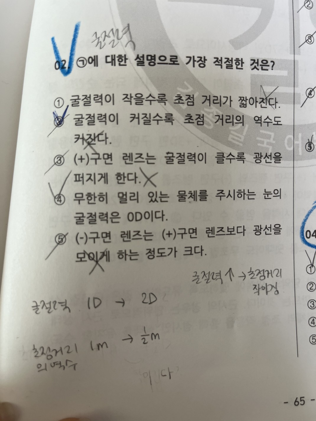 2번 선지에서 초점거리의 역수 = 굴절력 이기 때문에 맞는선지인 건가요?