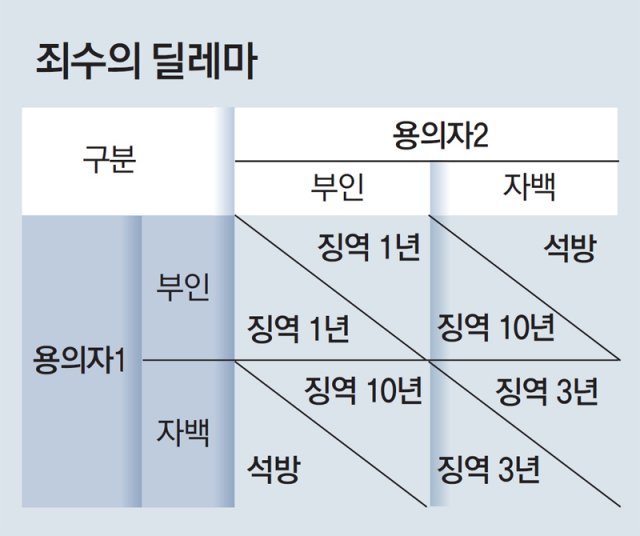 이 순간 이들은 공범인 친구와 맺은 약속이 떠오릅니다. “우리가 붙잡히더라도 증거는 거의 없을 거야. 우리가 서로 고자질만 하지 않는다면 우리는 모두 징역 1년 정도로 마무리되겠지. 의리! 절대 배신하지 말자!” 하지만 노련한 형사는 여기에 덧붙입니다. “당신의 친구는 수사 협조에 대한 기여가 참작되어 아마 집행유예로 풀려날 겁니다. 잘 생각해서 결정하세요. 친구의 범행을 말하지 않으면 당신이 모든 죄를 떠안게 됩니다.” 순간 흔들리게 된 용의자는 묻습니다. “만약 제가 모든 걸 말하면 어떻게 되나요?” “아마도 둘 다 징역 3년에 처해질 겁니다.”
