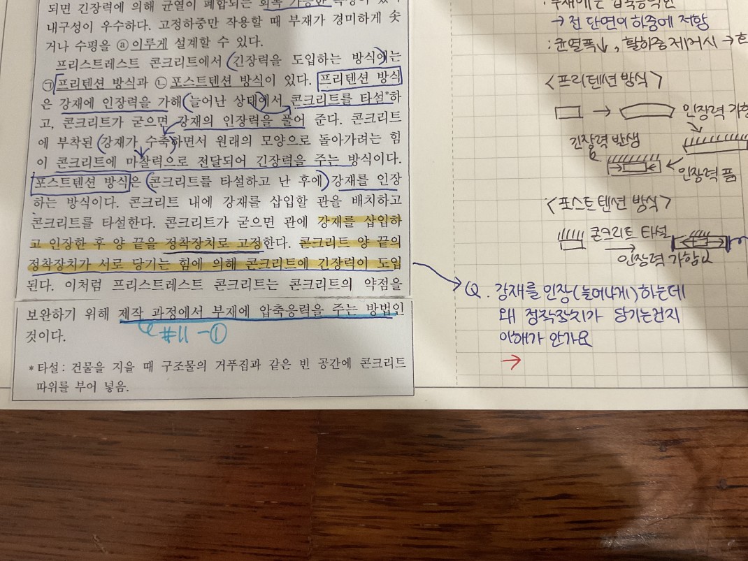 노란색 밑줄 친 부분에서 강재를 인장(늘어나게) 하는데 왜 정착장치가 당겨지는건지 이해가 잘 안가요!