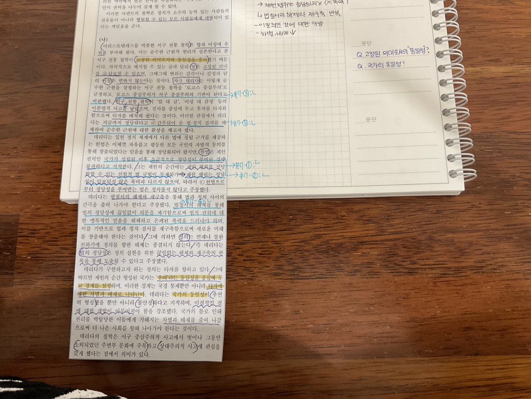 아래쪽 노랜 형광펜에 ['우리'는 '동일성'을 중심에두고 경계를 설정하여, 타자에 대한 차별과 배제를 한다.]