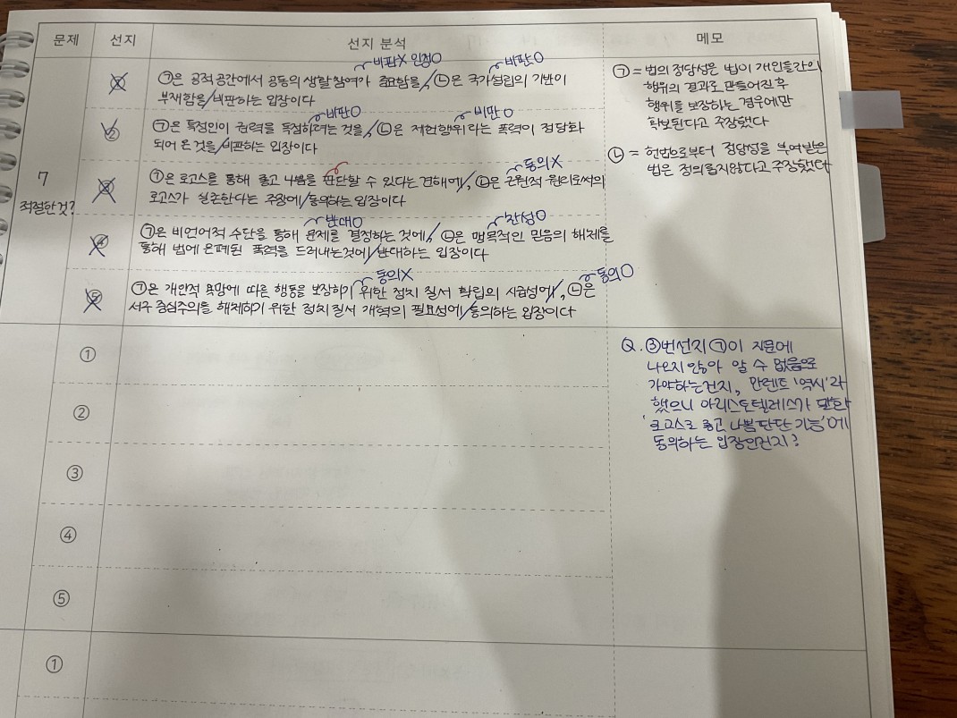 이에 더해, 7번 문제의 경우, ㄱ에 대해서는 한나 아렌트도 로고스를 중시했으므로(물론, 다원성도 함께 중시), ㄱ 부분은 크게 문제가 없어 보입니다.(동의) ㄴ이 문제가 됩니다. (ㄴ 부분은 해설지 참조)